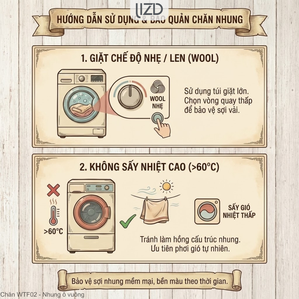 giặt tay nhẹ nhàng. Tránh sấy ở nhiệt độ trên 60°C để bảo toàn cấu trúc sợi và